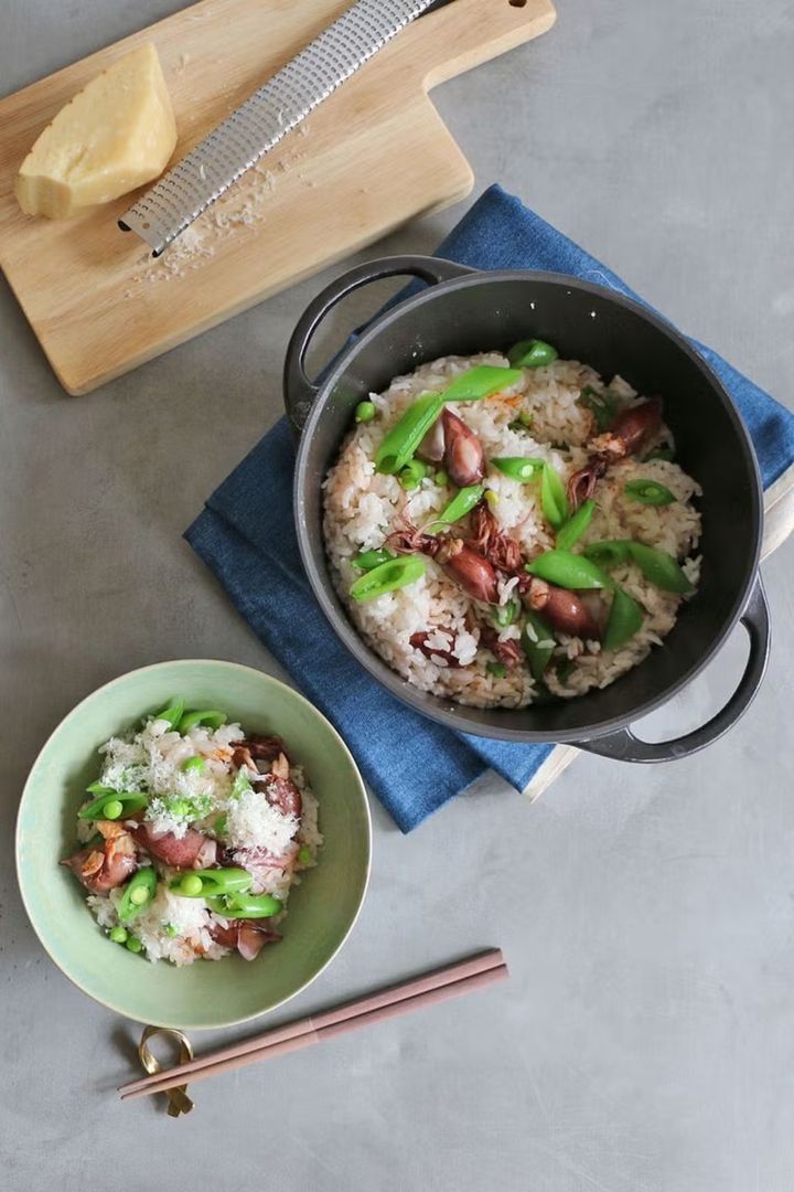 昆布だし香るご飯に、ほたるいかのうま味が染み込み、あとを引くおいしさに。スナップえんどうの甘みとパリッとした食感がアクセント。仕上げにパルミジャーノ・レッジャーノを削ってコクをプラスして。