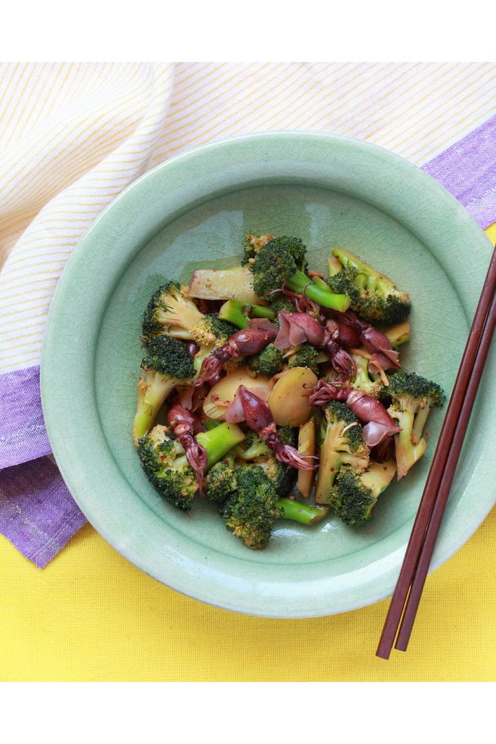 蒸し焼きにして甘みを引き出したブロッコリを、コチュジャンでピリ辛に味付け。そこに、ほたるいかのクリーミーなうま味が重なれば、お酒が進むやみつきの味わいに。丸ごと一株使ったブロッコリも、ぺろりと食べ切れそう。