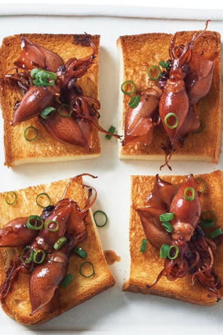 香ばしく焼いたトーストの上に、甘じょっぱい照り焼きのたれに絡めたほたるいかをオン。ほたるいかのコクのあるうま味と、万能ねぎの青々しい香り、トーストの甘みが絶妙にマッチする。
