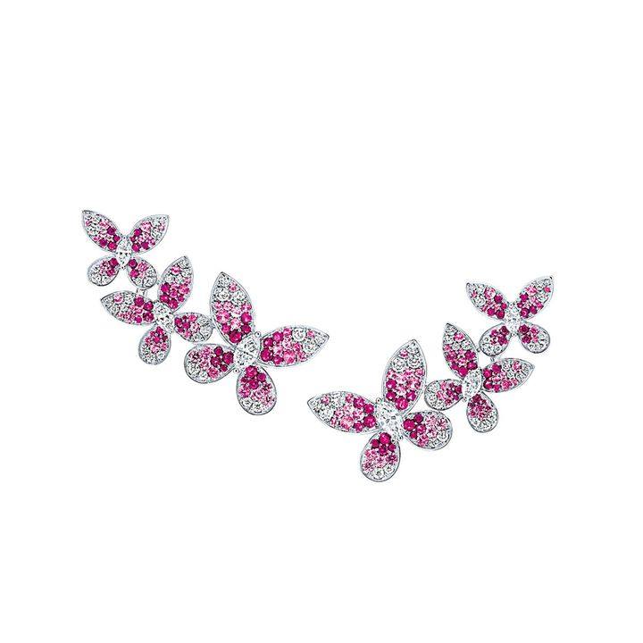 グラフを代表するコレクション“パヴェ バタフライ”から、ピンクのグラデーションが印象的なピアスが登場。それはまるで、バタフライたちが顔周りで華麗に舞っているかのよう。それぞれのバタフライは、マーキスカットダイヤモンドを中心とし、ピンクサファイア、ルビー、ダイヤモンドのパヴェセッティングが羽を美しくかたどるデザインです。