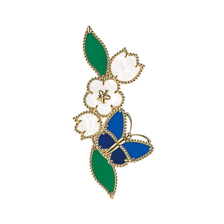 幸運と喜びをテーマとする本作は、メゾンの自然に対する愛を反映。ブローチ“ラッキー スプリング”[YG×ラピスラズリ×アゲート×マザーオブパール]¥1,491,600(Van Cleef & Arpels/ヴァン クリーフ&アーペル ル デスク) Hearst Owned