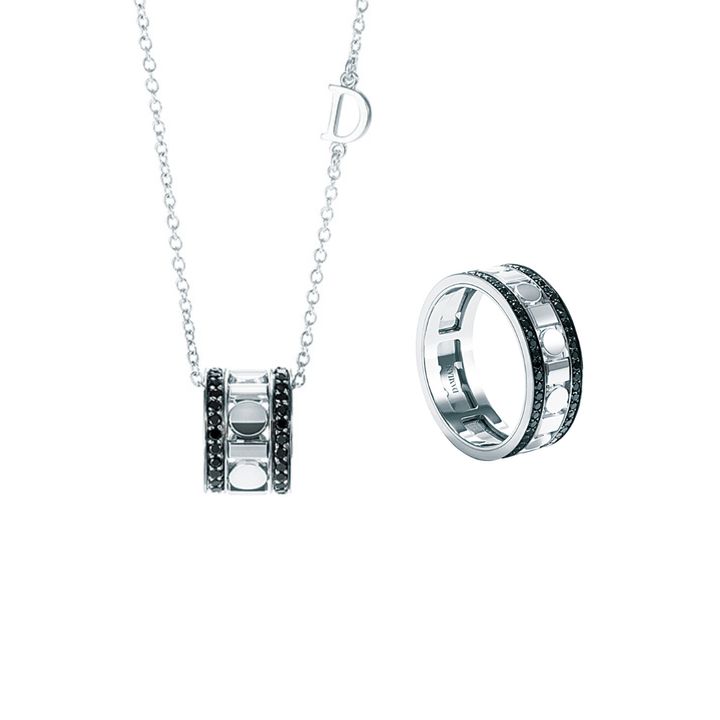 フィルムリールのように中央で回転する仕組みがプレイフルなシリーズ。“ベル エポック・リール”[WG×ブラックダイヤモンド]〈右〉リング¥910,800~〈左〉ネックレス¥742,500(2点共Damiani/ダミアーニ・ジャパン) Hearst Owned
