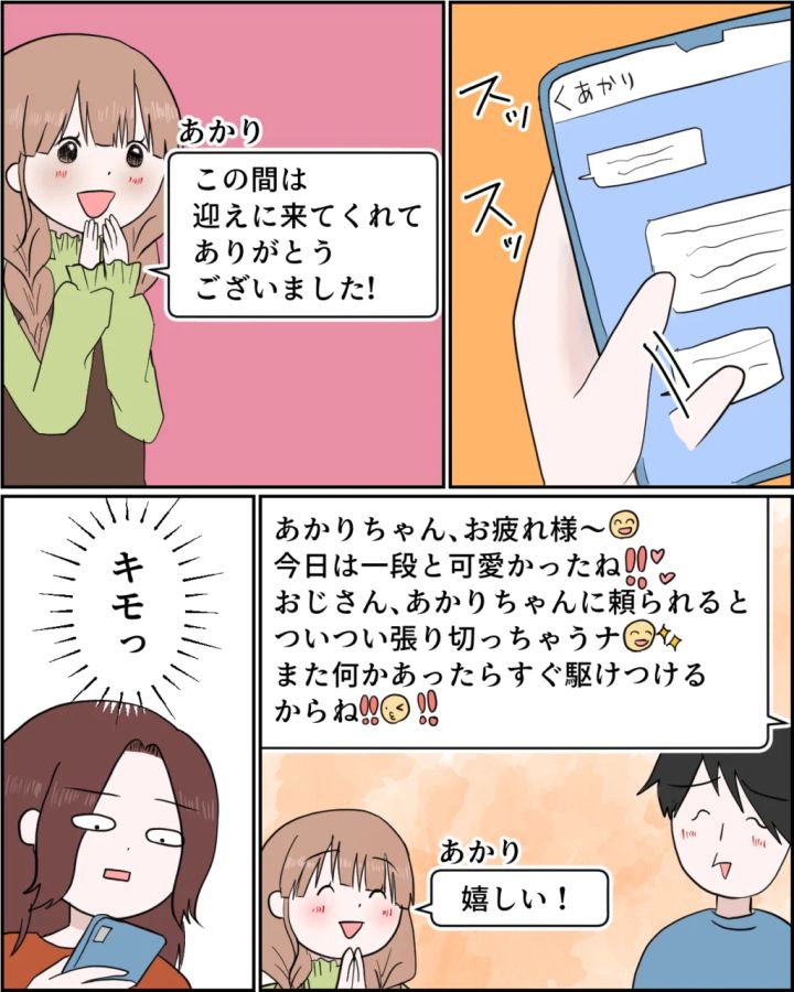 2人のやり取りを遡ってみると、『この間は迎えに来てくれてありがとうございました!』というあかりさんのメッセージに対し、『あかりちゃん、お疲れ様~。今日は一段と可愛かったね!!おじさん、あかりちゃんに頼られるとついつい張り切っちゃうナ。また何かあったらすぐ駆けつけるからね!!』と、これでもかというほど絵文字をふんだんに使って返信している謙介。やっぱりキモっ!