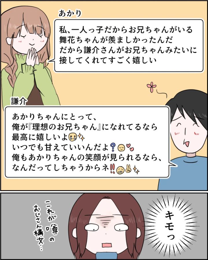 やり取りはまだまだありました。『私、一人っ子だからお兄ちゃんがいる舞花ちゃんが羨ましかったんだ。だから謙介さんがお兄ちゃんみたいに接してくれてすごく嬉しい』『あかりちゃんにとって、俺が「理想のお兄ちゃん」になれてるなら最高に嬉しいよ。いつでも甘えていいんだよ?俺もあかりちゃんの笑顔が見られるなら、なんだってしちゃうからネ!!』あぁ、これが噂のおじさん構文というやつね。ほんとキモっ。