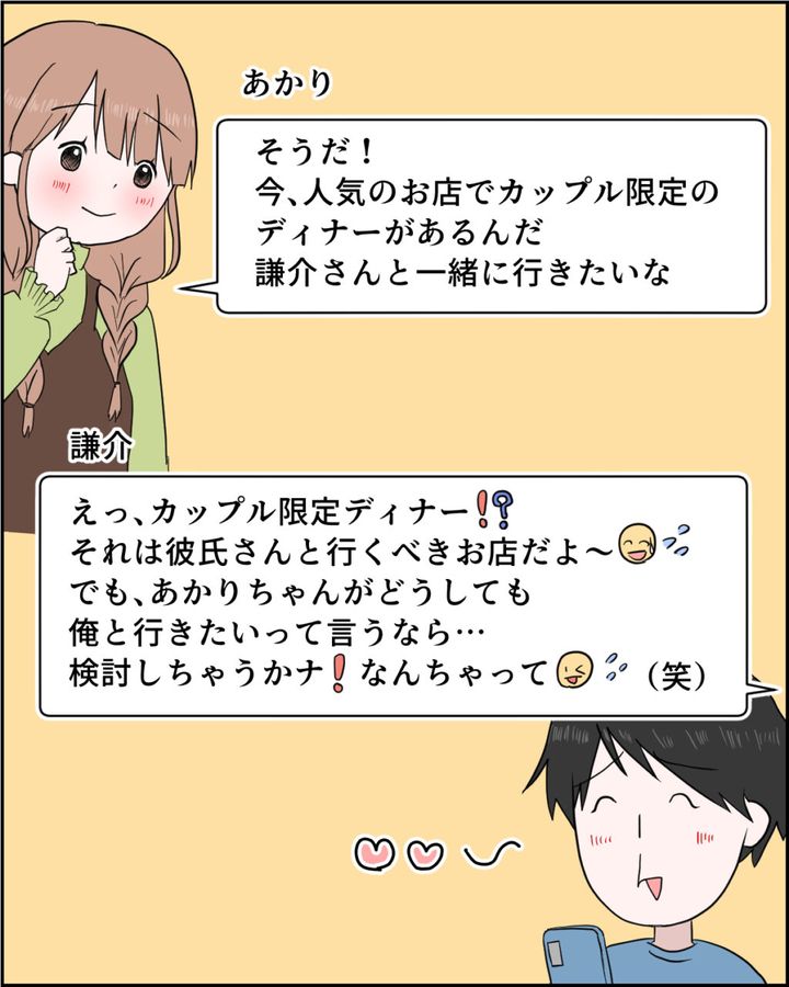 さらに、『そうだ!今、人気のお店でカップル限定のディナーがあるんだ。謙介さんと一緒に行きたいな』とあかりさんに誘われると、『えっ、カップル限定ディナー!?それは彼氏さんと行くべきお店だよ~。でも、あかりちゃんがどうしても俺と行きたいって言うなら・・検討しちゃうかナ!なんちゃって(笑)』とたしなめる素振りを一応見せつつも、行きたい気持ちが隠しきれていない謙介。