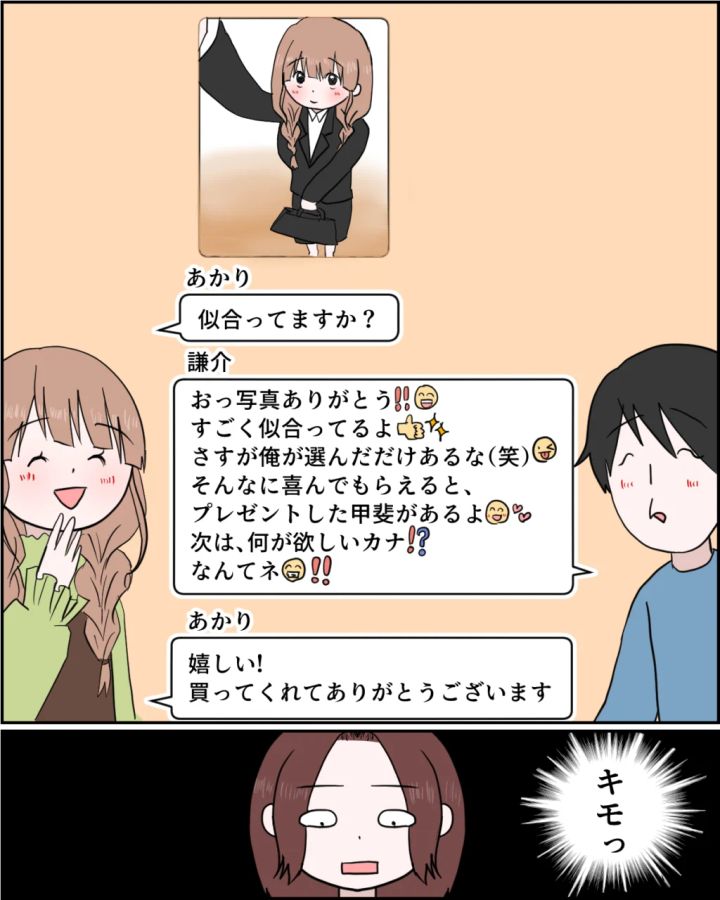 そして、さらにやり取りを見ていくと、上目遣いで自撮りした女性の写真とともに『似合ってますか?』というメッセージ。それに対して『おっ写真ありがとう!!すごく似合ってるよ。さすが俺が選んだだけあるな(笑)そんなに喜んでもらえると、プレゼントした買いがあるよ。次は、何が欲しいカナ!?なんてネ!!』とこれまた絵文字だらけで返信していた謙介。一瞬、謙介がパパ活でもしているのかと思いましたが、写真の女性は謙介の従妹のあかりちゃんのようでした。舞花ちゃんよりもさらに若いあかりちゃんから甘えられて鼻の下を伸ばしてデレデレになっている謙介の顔が目に浮かびます。・・キモっ。