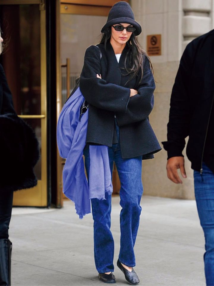 ここ数年、デニムはワイドシルエットが定番化していますが、今春は細身のストレートでイメージを刷新。ケンダルのようにシンプルなトップスと合わせるのがスタイルを洗練させるキー。