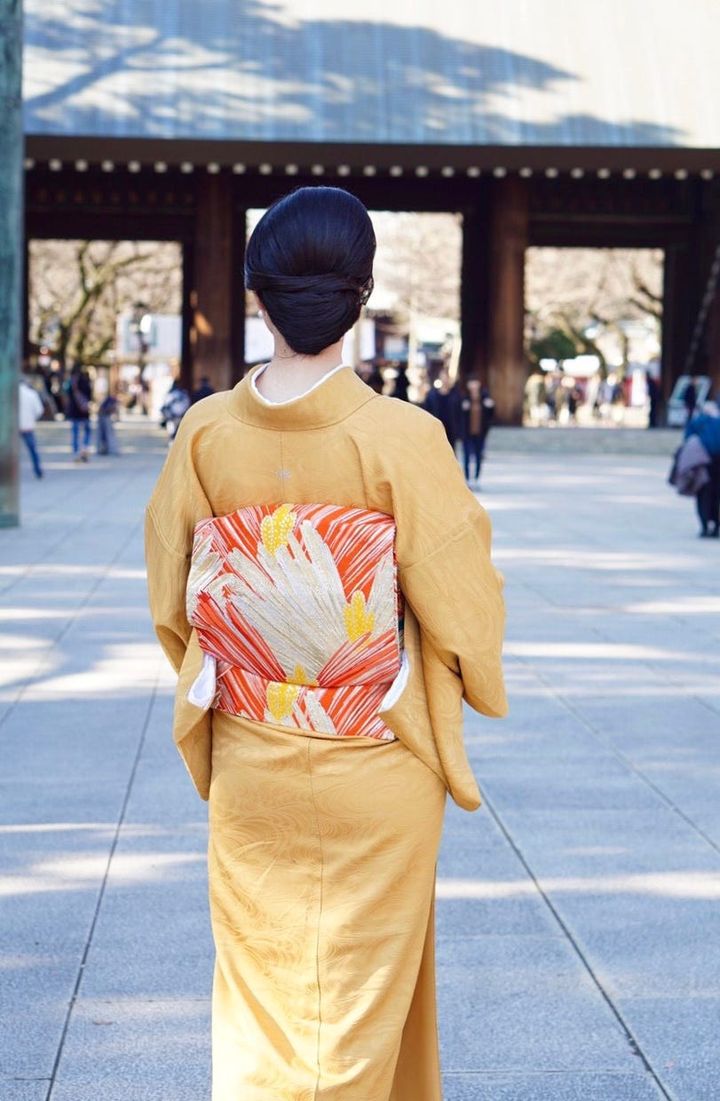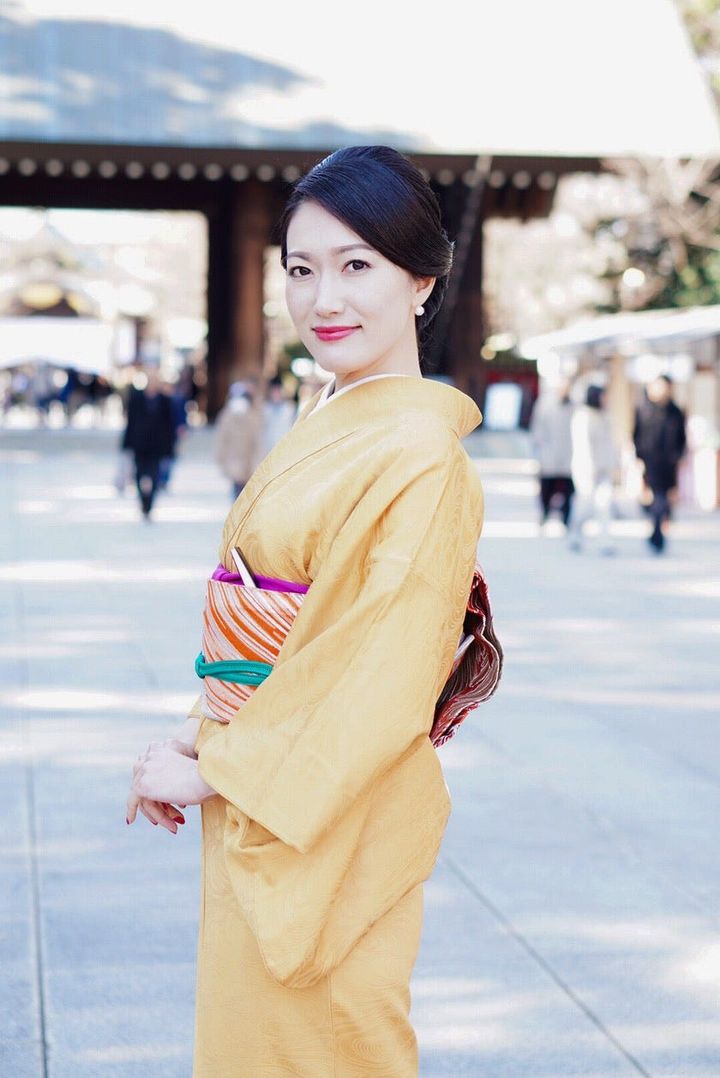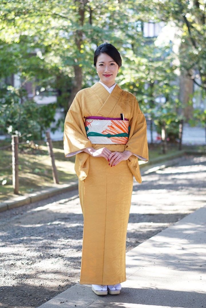 「この日は友人と能楽鑑賞へ。芸術鑑賞には、鮮やかな色を組み合わせるのが好きですね。周りと被りにくい山吹色の色無地を主役に、帯揚げと帯締めに強めの差し色をパキッと効かせて“私らしさ”を忍ばせました」