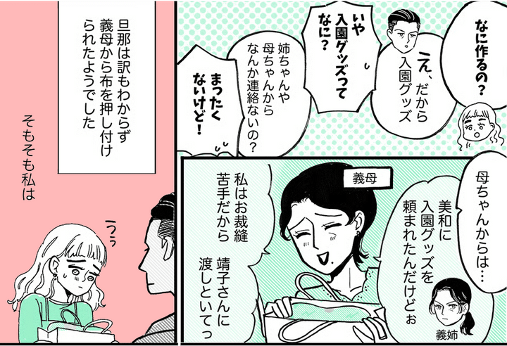 『義姉の子どもが入園をするので、園指定の手作りバッグを作るように義母から頼まれました。夫が義母から渡された布を持ち帰ってきました。私は作れないわけではありませんが、義母と義姉が嫌いだから作りません。その布を義姉の旦那さんに渡したところ、義姉が激怒し、義母からお怒りLINEと鬼電がきています。また布がきたら同じ流れでいいですよね? 今、私の実妹に頼まれた姪っ子の入園準備グッズを楽しく作っています』出典:https://mamastar.jp/bbs/topic/4034171