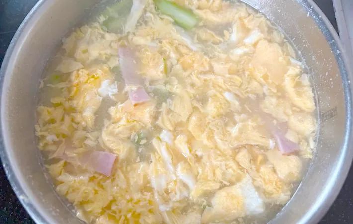 アスパラガスがやわらかくなったら、ベーコンと溶き卵も投入しましょう。