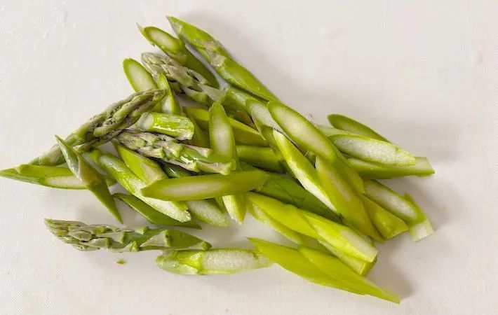 アスパラガスは、根の部分を切り落とし、斜め切りにします。根元は筋っぽさが気になるため、根元から3分の1ほどをピーラーで剥いてから切るのがおすすめです。
