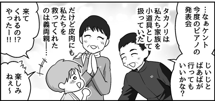 タカノリの行動原理は「親を安心させるため」でした。結婚して子どもを持った姿を見せることで、恩返しをしたかったのでしょう。しかし嘘と演技で固めた結婚が崩れてしまった今……。もはや義両親はタカノリには見向きもしません。