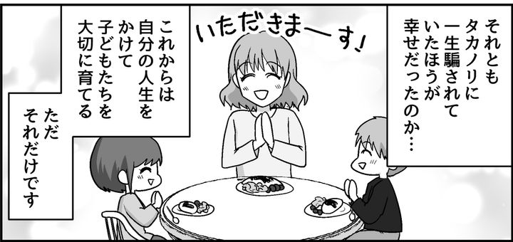 私は愛情のない夫婦関係から逃れられて良かったのか、それとも気づかないふりをして一生騙されていた方が幸せだったのか……。今は子どもたちのためにも、今後の生き方でこの選択を「正解」にしようと決意しています。