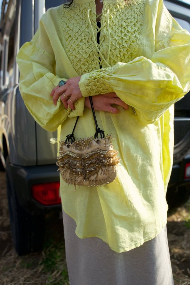 「PURのブラウスは、今の季節にぴったりなビタミンカラーをチョイス。丈感が絶妙で、ロンスカともバランスがとりやすいんです。クラフト感漂うバッグはJamin Puech(ジャマン・ピュエッシュ)のもの。職人の手作業で作られたもので、着こなしのスパイスになってくれます。足元は、ASICSのスニーカーでボリュームを足しました」(PURデザイナー・八木下泉さん)