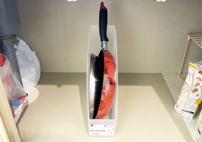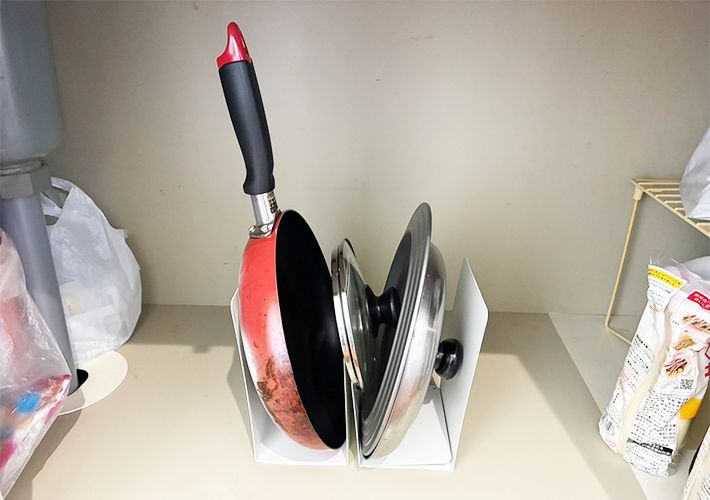 ファイルスタンドには深さと高さがあるため、重さのあるフライパンや丸い鍋蓋を入れてもグラつかず、しっかりと支えてくれます。