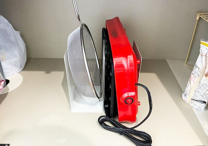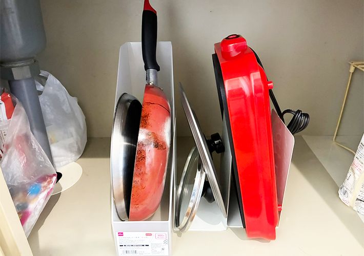 物が多いキッチンはどうしてもゴチャゴチャになりがち。特に、フライパンやホットプレートなどのサイズが大きい調理器具は場所を取るため、棚の中が乱雑になってしまいますよね。