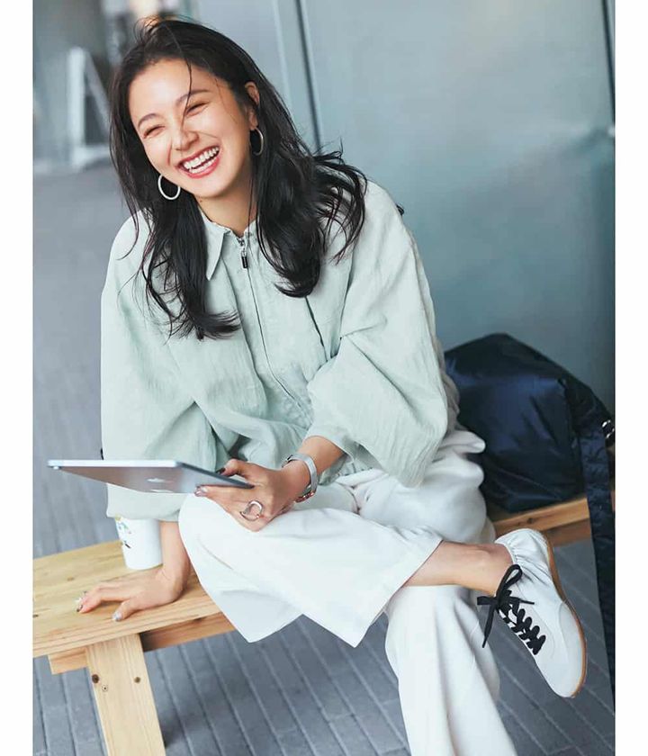 ブルゾンブラウス¥18,920(メゾンスペシャル 青山店)パンツ¥22,000(カデュネ)バッグ¥28,600(エス/sense)スニーカー¥17,600(オデット エ オディール/オデット エ オディール 新宿店)ピアス¥42,900(ete bijoux)時計¥23,100(Jouete)リング¥13,750(ソワリー)