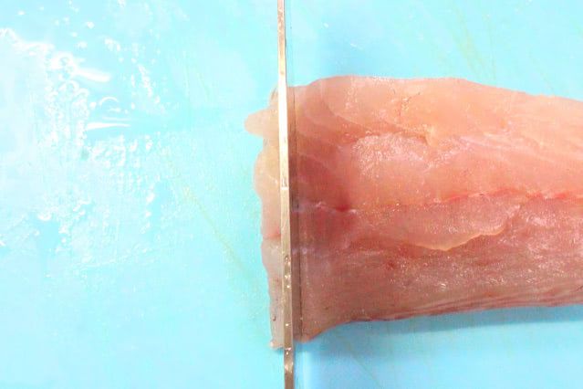 白身魚の場合は皮側を下にし、厚みが高い方を奥にして置きます。そぎ造りの場合は包丁をねかせ、サクの左側から斜めに刃を入れます。
