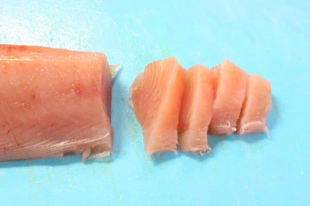 今回は、幅1.5cmほどの平造りにしたヨコワ3切れを40秒ほど茹でました。