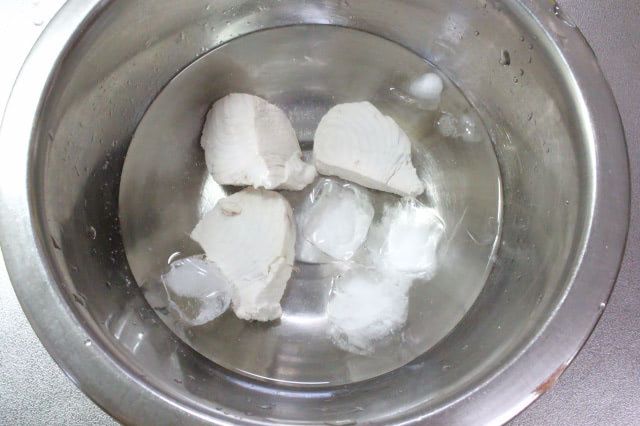 ヨコワの中まで火が入らないように、茹でたらすぐに氷水で粗熱を取ります。1分ほど冷やしてキッチンペーパーで水気を拭き取りました。