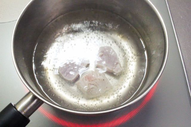 1. 棒状に切ったマグロを熱湯で表面が白くなる程度に茹でます。