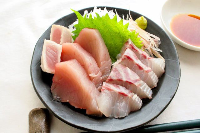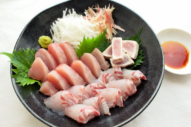 こちらが「1人前の刺身の盛り合わせ」です。直径15cmのお皿にヨコワ3切れ、スズキ4切れ、ヨコワの湯引き2切れを盛りつけました。