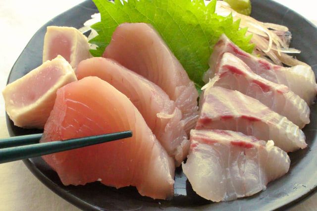 画像ではわかりにくいですが、大根とみょうがのツマに高さをつけ、そこに刺身をもたれさせ、ヨコワとスズキをずらして断面が少しずつ見えるようにしてみました。
