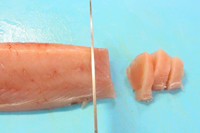 平造りにする場合はサクの右側から、サクに対して直角に包丁を入れます。今回は幅1cmくらいに切っていきます。