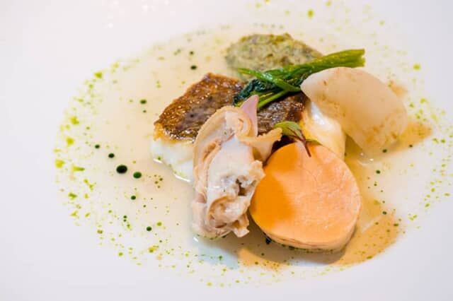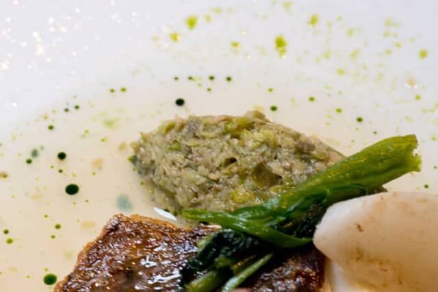 この日の魚料理はグリルした真鯛です。白ワインで酒蒸しした蛤の出汁で作られたスープが敷かれ、風味が格別にいい一皿。付け合わせに蛤や蕪、丸い鯛の子も添えられます。ふっくらとした真鯛はそのままでも自然な美味しさを味わえますが、個性的なタップナードをつけても楽しめます。