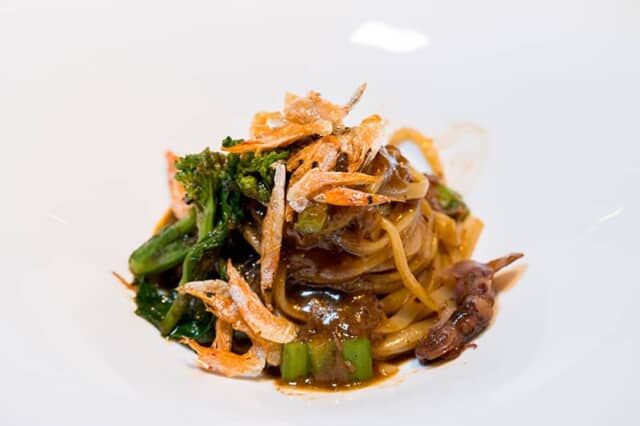 ホタルイカと桜えび、菜の花といえば、どれも春の訪れを告げる旬の素材。ホタルイカたっぷりのピューレを使った濃厚でコクのあるパスタソースと、素揚げした桜えびのクロッカン(カリカリとした食感)の香ばしい風味、菜の花の心地よいほろ苦さが口の中で入れ替わり立ち代わり三重奏を奏でる春のパスタです。