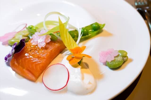 グリルした和牛のフィレ肉は脂身も控え目で、バルサミコソースとほんのり甘い桜のソース、さらにタケノコのピューレの3種類の味付けで楽しめます。付け合わせには、こごみやタラの芽、芽キャベツなど春の芽生えを象徴する野菜が添えられ、驚いたことに桜の葉も加わって、日本人にはなじみ深い風味が口の中に広がります。和牛と共に “春の味” を満喫しました。