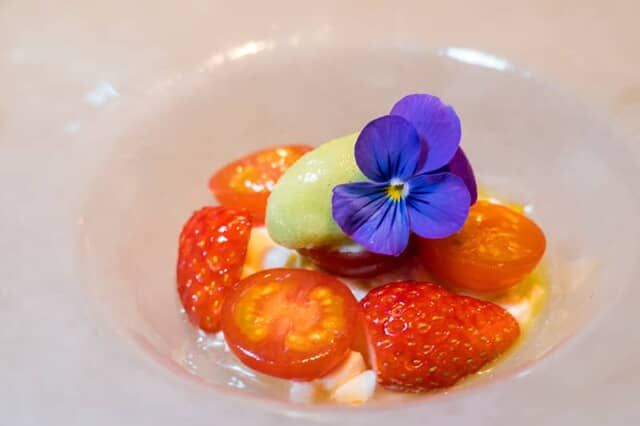 「最初の一皿」は思いがけないはじまり。お皿の底に敷かれたブラッターチーズの上に苺とチェリートマトがのり、バジルのソルベとエディブルフラワーが飾られて彩りも華やか。バジルの朗らかな風味と苺の甘酸っぱさがマリアージュして、ほのかな塩味も加わります。イタリア料理の定番ともいえるトマト、モッツァレラチーズ、バジルのカプレーゼを、自由な発想でイノベーションした意外性のある一皿でした。
