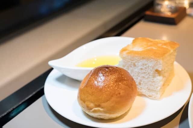 パンはお隣にあるグランドプリンスホテル新高輪で焼かれたホテルメイドのミルクパンとフォカッチャで、オリーブオイルが添えられます。提供時にリベイクされ、ミルクパンはほんのり甘くフワリと柔らか。フォカッチャもフカッとしていてコクがあり、お代わりをしてしまいました。