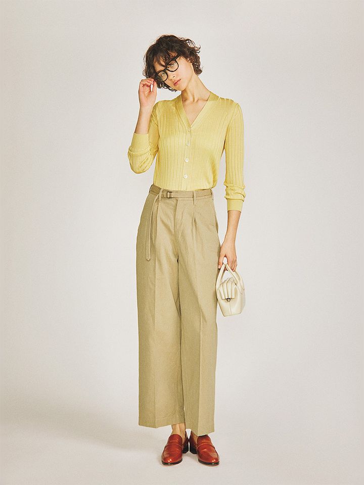 【POINT】パンツと一体化したベルトで引き立つくびれがポイント。タイトめにインしたトップスとつながりよく、ベージュで統一したトーンも縦に長く・華奢な体に見えるポイント。