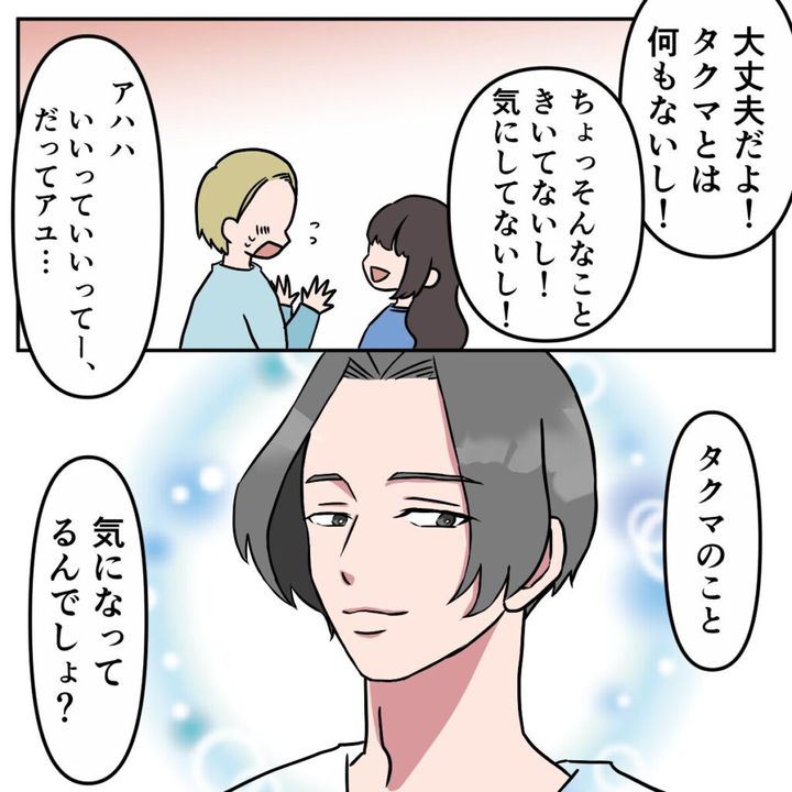 アユさんには、大学時代にサユリさんという親友がいました。男勝りなアユさんに対し、サユリさんは小柄で可愛くてまさに守ってあげたくなるような女の子。そのせいか男性からの人気も高く、デートのお誘いが絶えません。でも本人はまったく興味なし。いつもアユさんを最優先してデートの誘いを断っていました。そんなある日、サユリさんはとある講義をきっかけに、アユさんにタクマさんという好きな人がいることを知ってしまいます。アユさんの恋路を邪魔しないよう気を遣うサユリさんでしたが、それから1週間が経ったある日のこと、アユさんは恋人同士のような距離感で親しげに話すサユリさんとタクマさんの姿を目撃してしまいます。なんでも、初めて2人を紹介し合った日に偶然タクマさんが教室に戻ってきて連絡先を交換したのだとか。それでも、お互いを呼び捨てで呼び合うほど距離が縮まった2人に、アユさんは複雑な気持ちを抱いてしまいました。