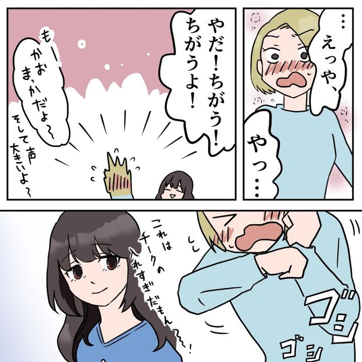 サユリに図星を突かれた私は「・・・えっ、やだ!ちがう!ちがうよ!」と慌てて首を横に振ります。けれど、そんな反応でごまかせるはずもなく、「顔、真っ赤だよ~」と楽しそうにからかわれてしまうのでした。