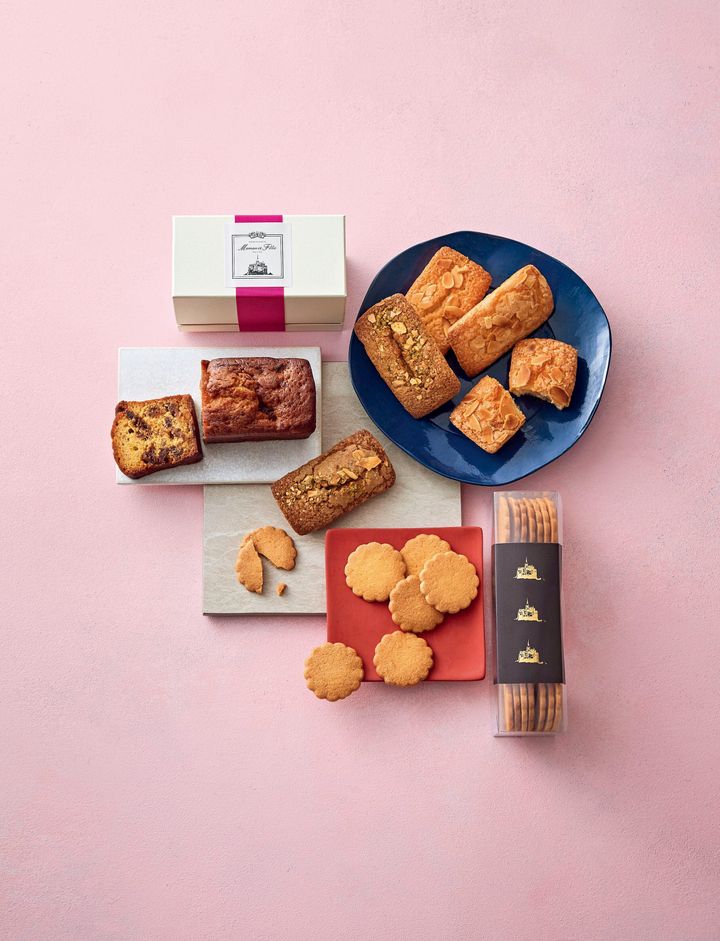右上から時計回りに、フィナンシェ2種、フレンチビスキュイ、熟成フルーツケーキ。どれも「マモン・エ・フィーユ」の人気商品ばかり。 撮影=川上輝明