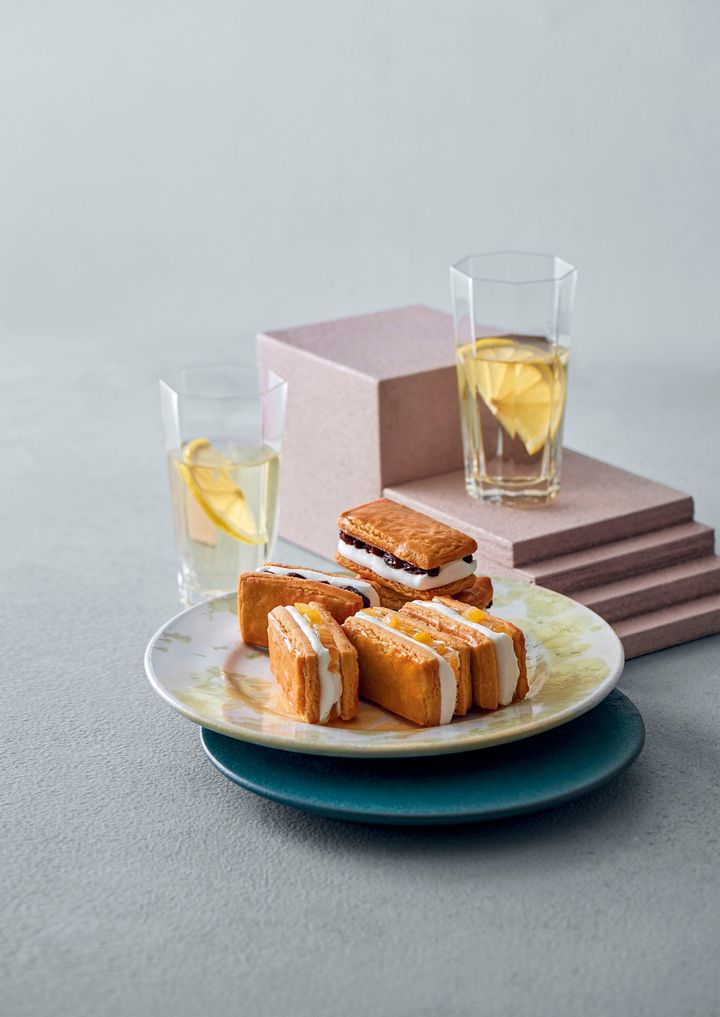 節目のお祝いには、はちみつレモンとレーズンがセットになった限定品が登場します。和歌山の「紀州原農園」産のレモンをコンフィにし、オレンジの花のはちみつで仕上げました。中には酸味が効いたレモンカードが潜んでいます。マスカルポーネがベースのクリームにもはちみつのリキュールを使用。甘い香りがふんわりと漂います。芳醇でジューシーなレーズンがおいしい定番サンドもコーヒーやお茶との相性抜群です。