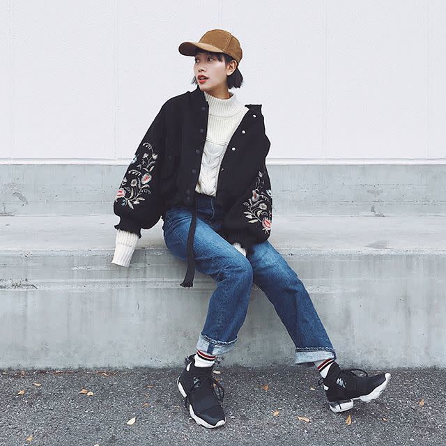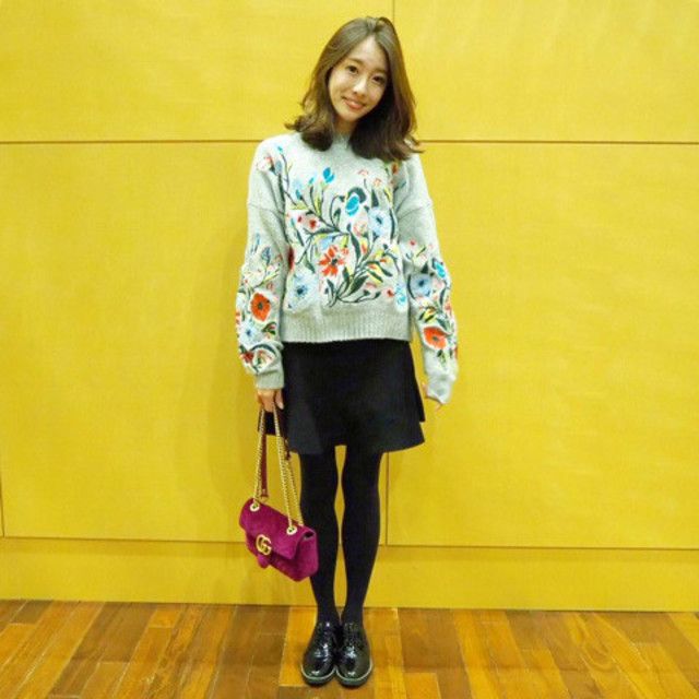 こちらは、大胆なボタニカル柄を刺しゅうしたニットをスタイリング。シンプルなワンツーコーデがパッと華やかに仕上がりますね。