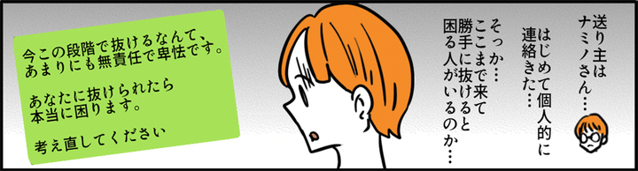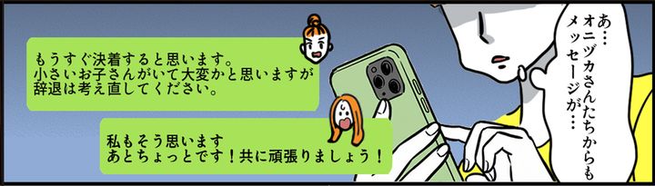 私はナギサ。私は育休中にスキルを身につけたいと思い、数十万円を払ってあるオンラインサロンに入会しました。しかし講義内容や指導があまりに薄っぺらくて愕然とします。やがてオニヅカさんを中心に、同じ講義を受講していた4人全員で返金請求をすることになりました。ただ娘を育てながらスマホを手放せず、常に緊張感が伴います。「育児と両立できないので辞退します」と言ったところ、強い非難のメッセージが届いてしまったのでした。