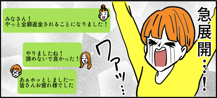「考え直してください」「あとちょっとで決着がつきますから」他の受講者たちにもそう励まされ、結局私は返金請求活動から抜けることができませんでした。すると翌週……。ようやくサロン側が折れたという連絡がきたのです。