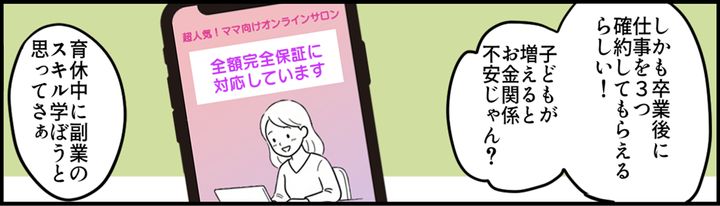 アヤカから見せられたスマホ画面には「育休中がチャンス!」「未来のキャリアが動き出す!」などと耳触りのいいキャッチーな言葉が並んでいました。その瞬間、脳裏に嫌な思い出がよみがえり、私は思わずアヤカに自分の経験談を語って聞かせたのでした。