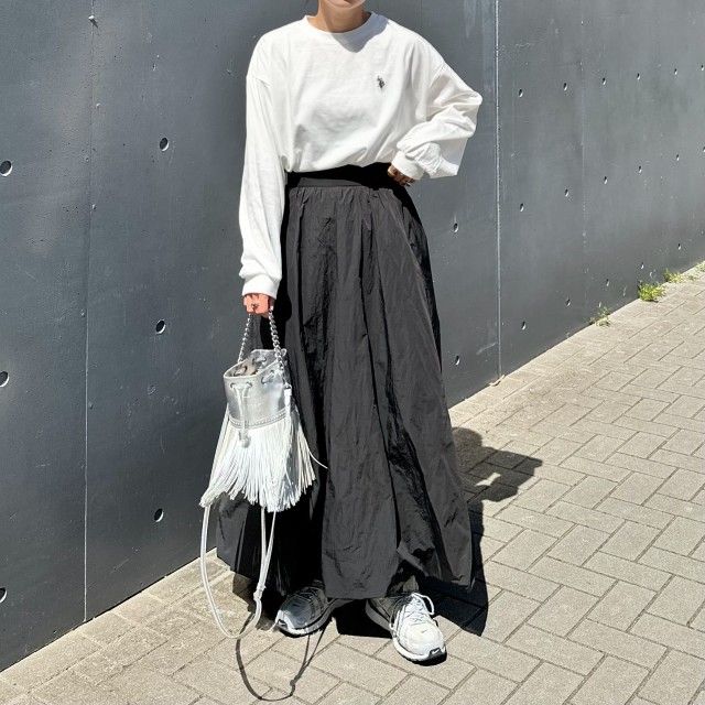 バルーンスカートにもっとも合わせやすい春のトップスは「ロンT(長袖Tシャツ)」。普段使い感のあるトップスのおかげで、お目立ちなスカートが着こなしやすくなりますよ。このときボリューミーなスカートがスッキリ見えるよう、ロンTの裾はウエストインするのがコツ。