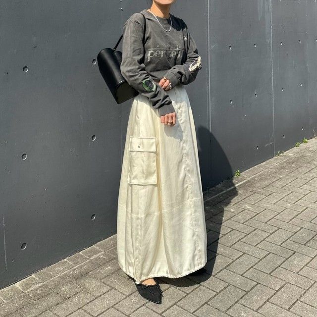 ロング丈のバルーンスカートと相性バツグンなのが「オフショルダーのスウェット」。トップスの肌見せが効いて、ふんわりカーブしたロングスカートが春らしい表情に。またスウェット生地で取り入れることでスポーティな雰囲気が加わるため、オフショルダーとバルーンスカートの掛け合わせが甘くなりすぎませんよ。