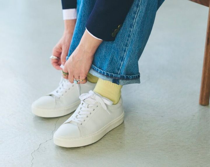 「同じ白スニーカーでも、ラインなどが入ったものだと少しスポーティな印象に。シンプルなオールホワイトなど、ワンカラーならきれいめに履けます」。