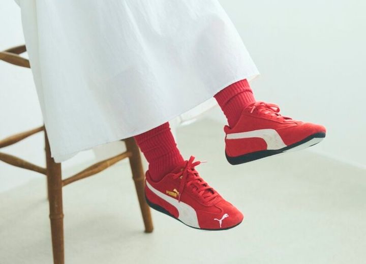右下:コーデの挿し色になるカラースニーカー。薄底のローテクタイプ。スピードキャット/プーマ