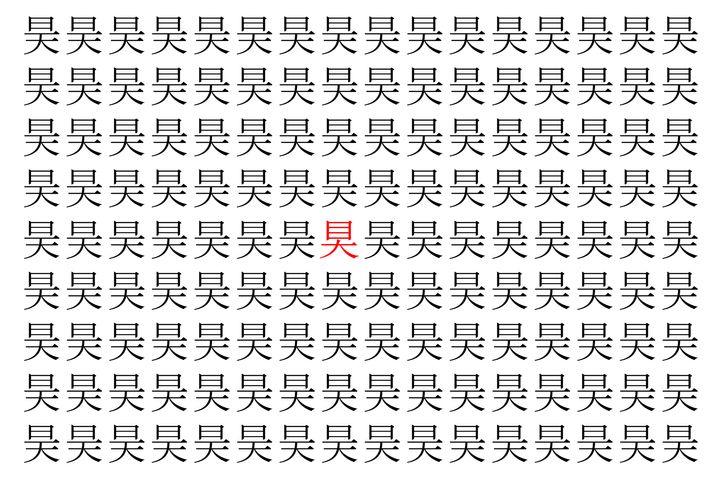 画像に並んだたくさんの「昊」という漢字。 その数144個なのですが・・・、実はその中に1つ違う漢字が紛れ込んでいます!!