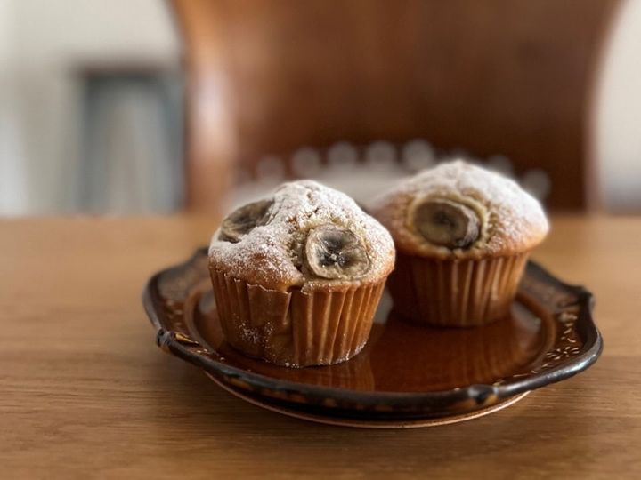 奥はプレーンなバナナマフィン。バナナをスライスしてのせてもかわいい。手前はベリーをのせたもの。最後に粉糖を少しふってもOK