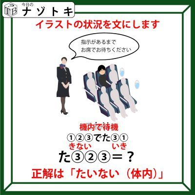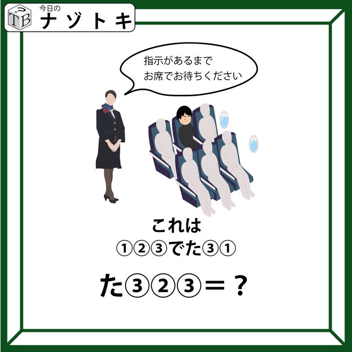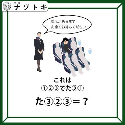 問題のイラストは飛行機の中でCAの方が「お席でお待ちください」とあります。ここから当てはまる言葉を考えてみましょう。飛行機の中のことを「機内(きない)」といいますね。また、待つことを「待機(たいき)」といいますね。文字数としてもぴったり合いそうです。それでは実際に当てはめてみましょう。すると「きないでたいき(機内で待機)」となります。同じ数字には同じ文字がはいることを考えるとぴたりと当てはまります。