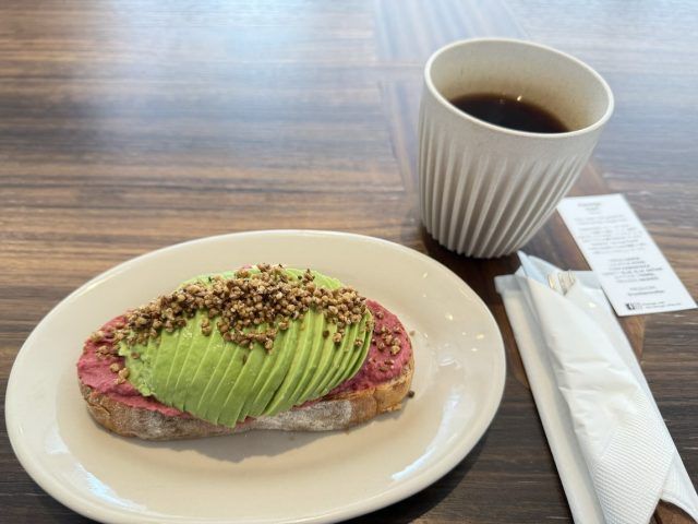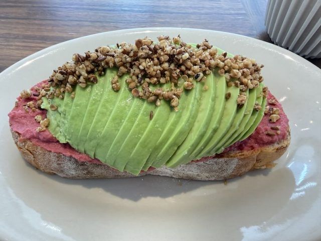 9時から12時まではモーニングメニューを提供。ポーチドエッグやギリシャヨーグルトなど色々メニューがある中で、私はアボガドとビーツのフムスをいただき。
